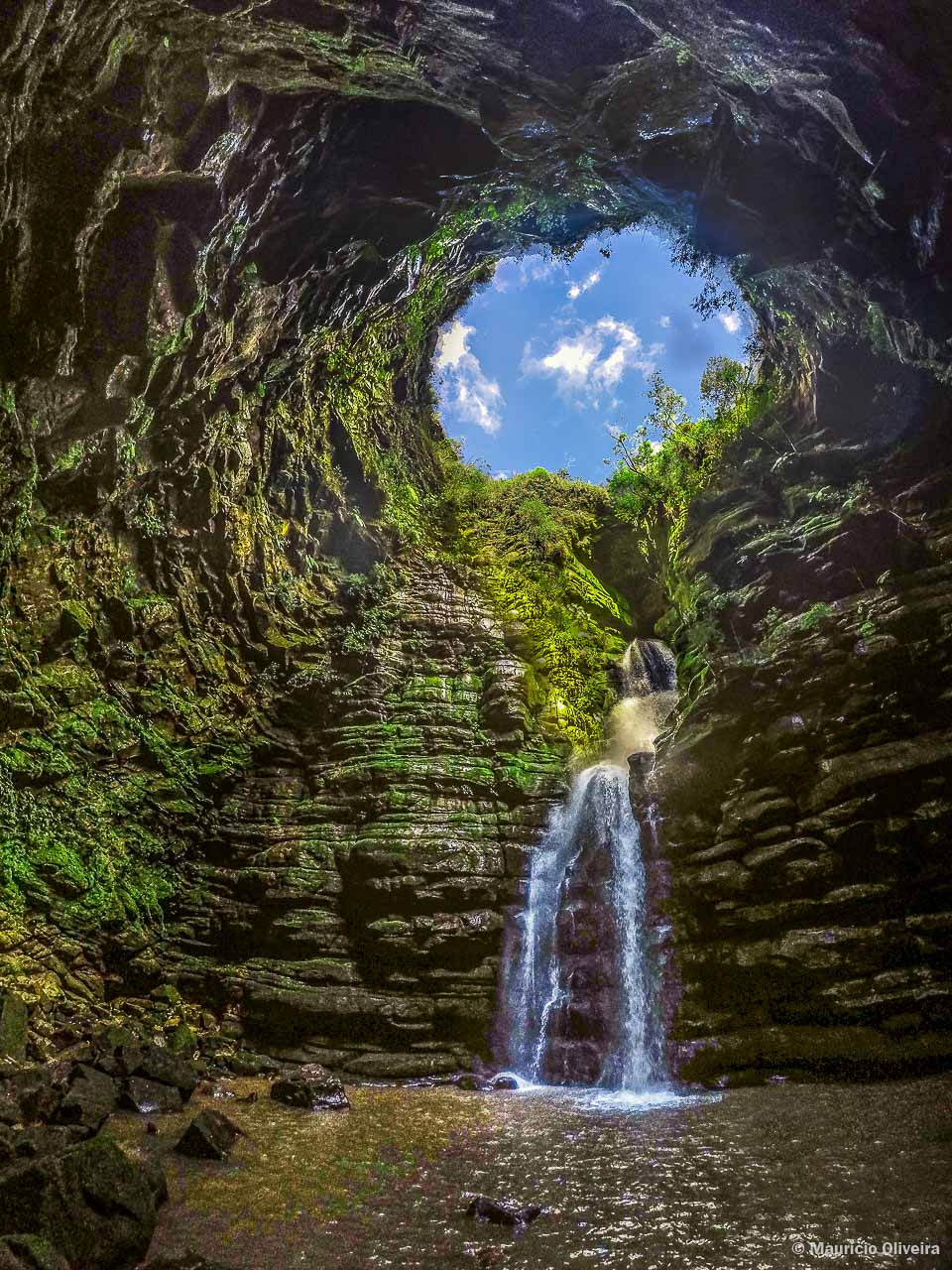 Um dos cartões-postais da região. A impressionante furna com uma cachoeira em seu interior proporciona um espetáculo único e inesquecível.
